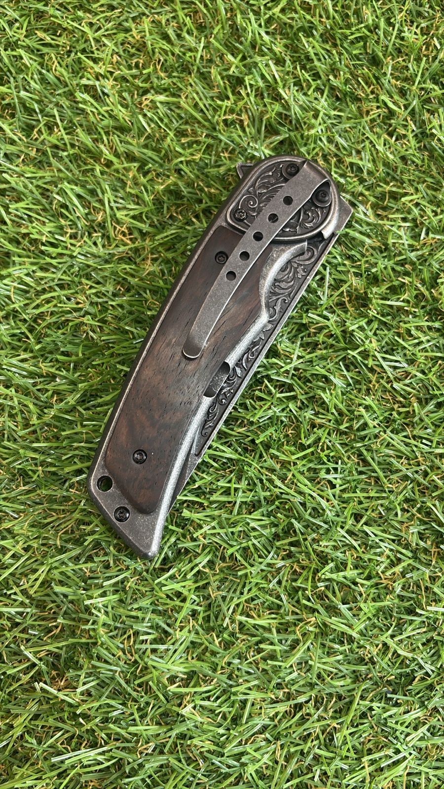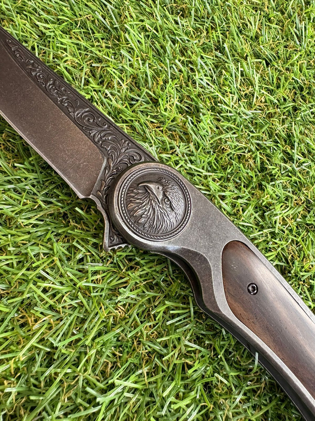 O Canivete Águia Hunter combina robustez, elegância e riqueza de detalhes em uma peça que chama atenção tanto pela funcionalidade quanto pelo acabamento diferenciado. Seu design marcante apresenta gravações ornamentais no corpo da lâmina e um imponente medalhão com a cabeça de uma águia na região do pivô, trazendo personalidade e estilo à peça.