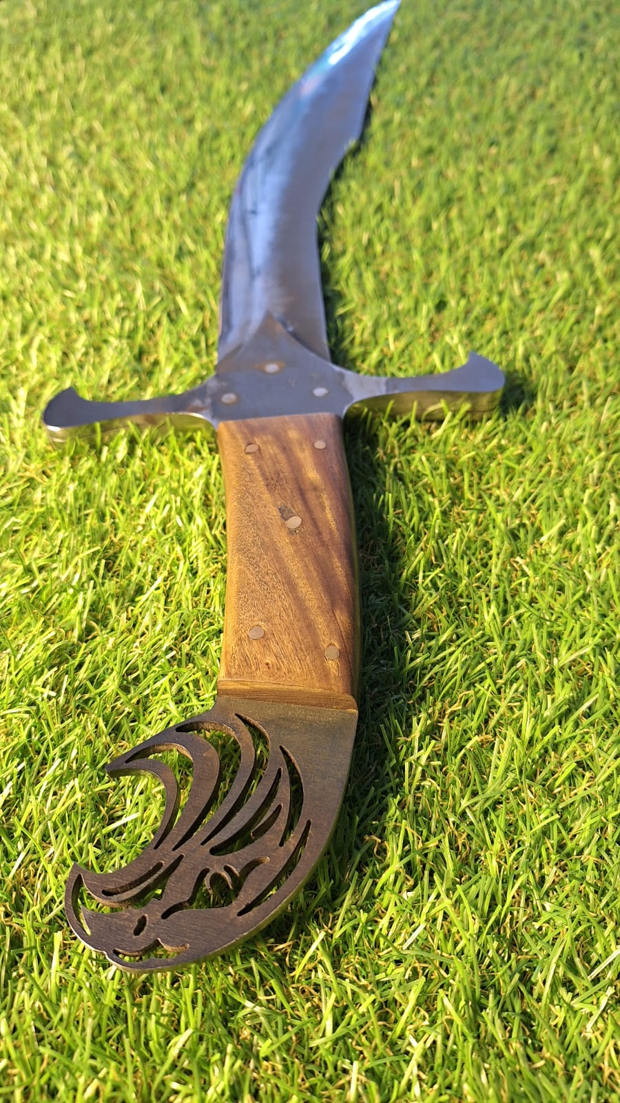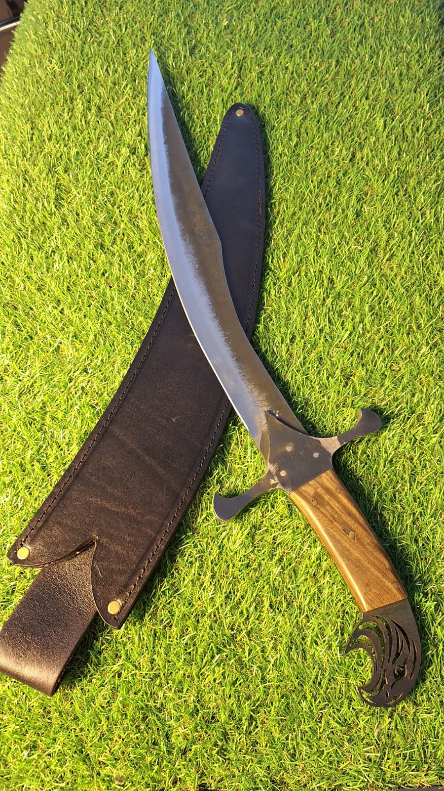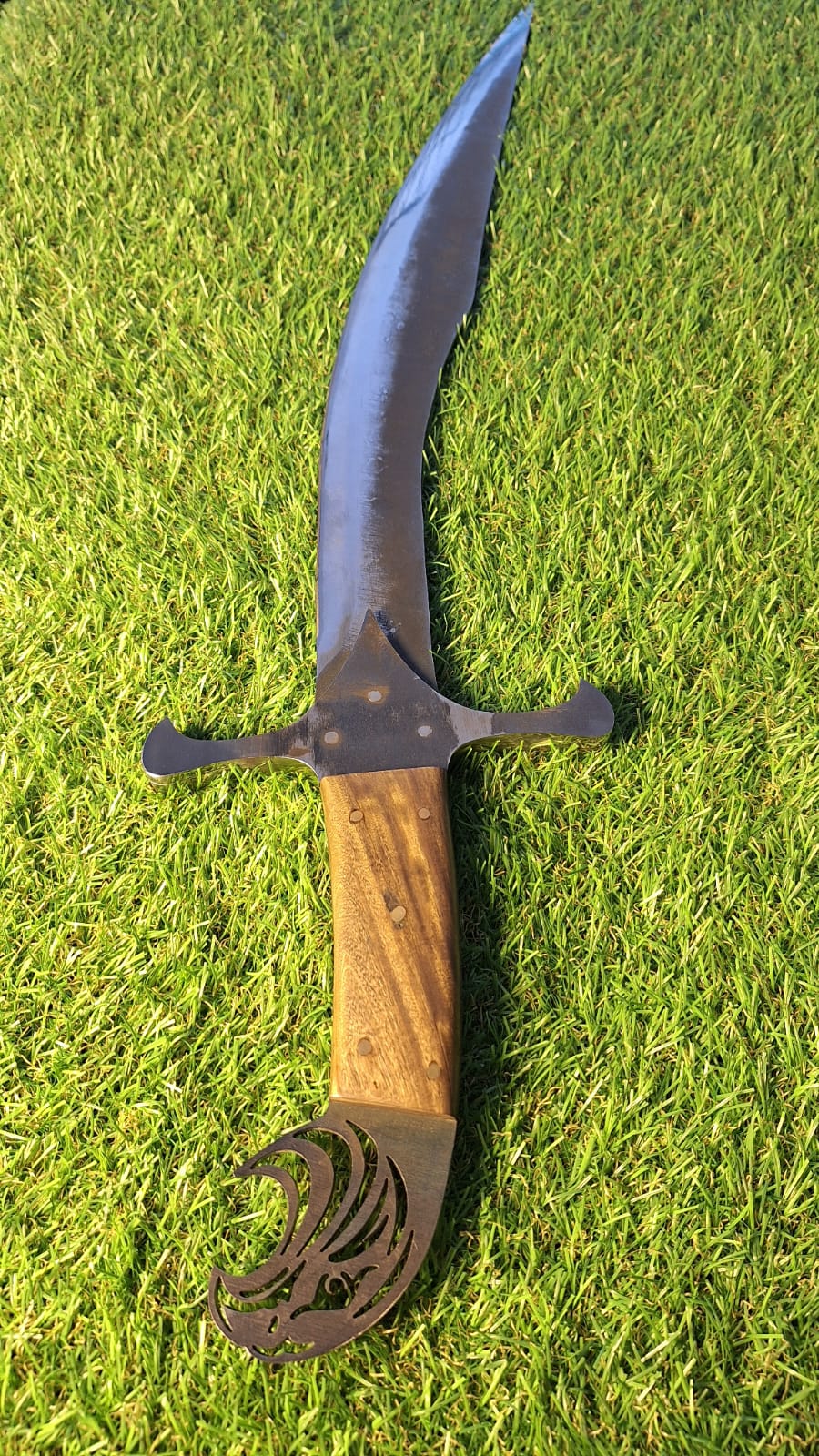 Uma peça digna de um guerreiro das areias. Esta cimitarra artesanal une brutalidade e arte em cada detalhe: da curva agressiva da lâmina ao entalhe decorativo no pomo. Com guarda dupla, cabo em madeira de lei envernizada e lâmina em aço carbono 1070 temperado e revenido com acabamento escurecido, é uma arma que impressiona em qualquer coleção.