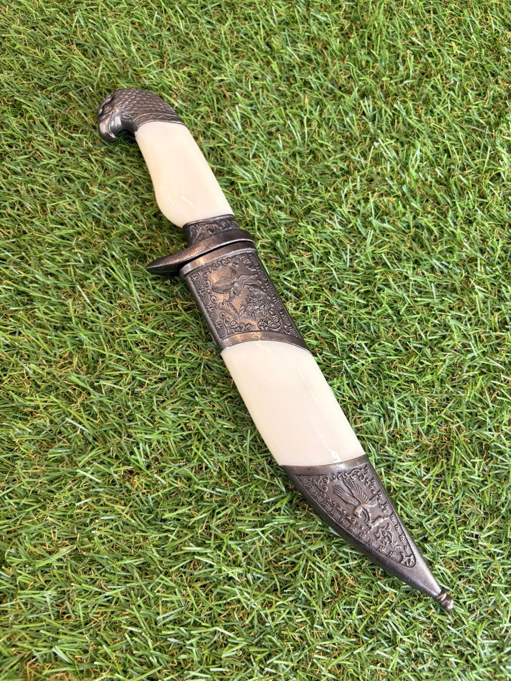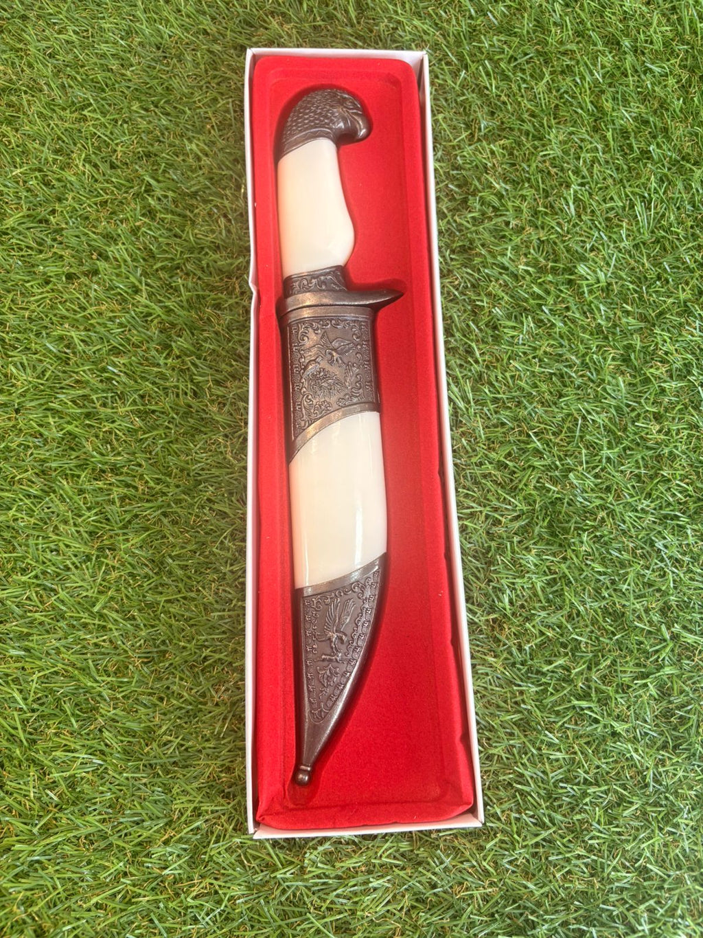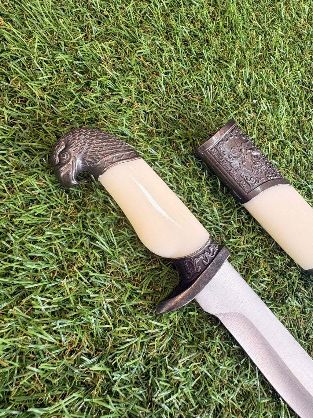 O grande destaque está no conjunto visual: pomo em formato de águia, detalhes gravados na bainha e acabamento que remete a peças clássicas de alto padrão.