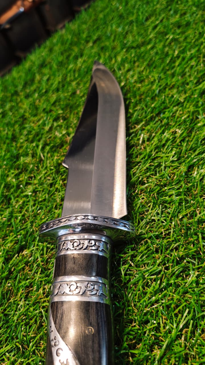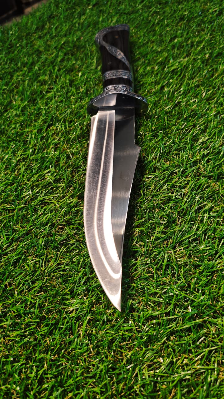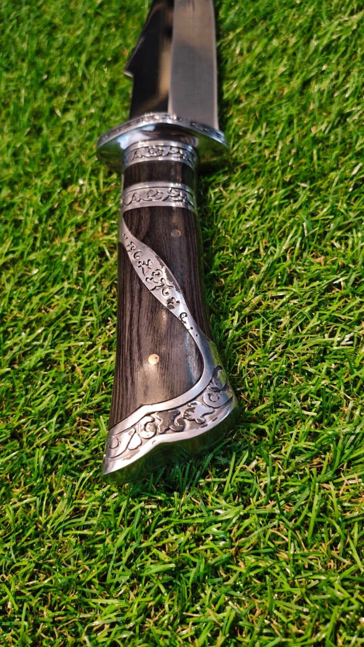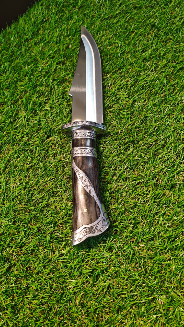 Faca lamina em inox 420ccGuarda e pomo inox em açoCabo e lamina com detalhes e cabo em madeira Acompanha bainha de transporte em nylon militar
