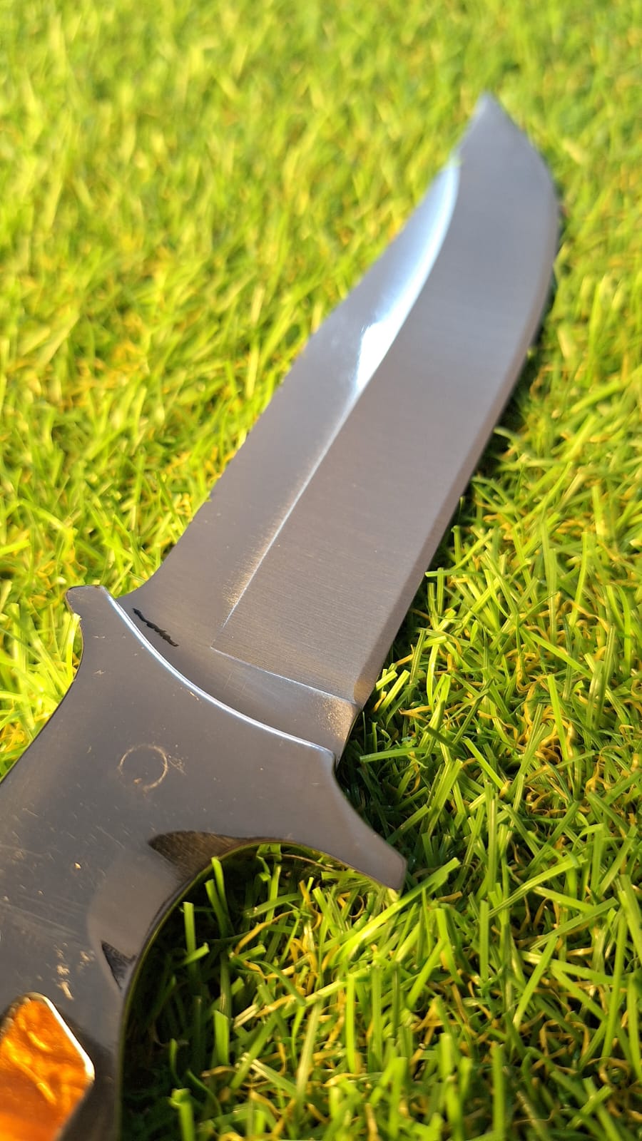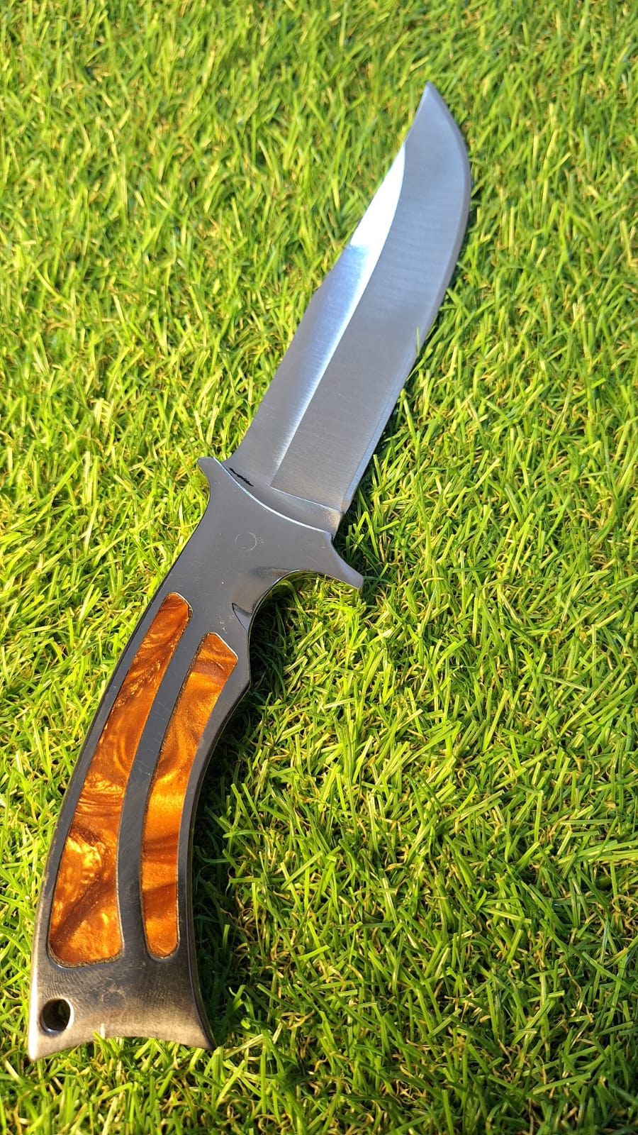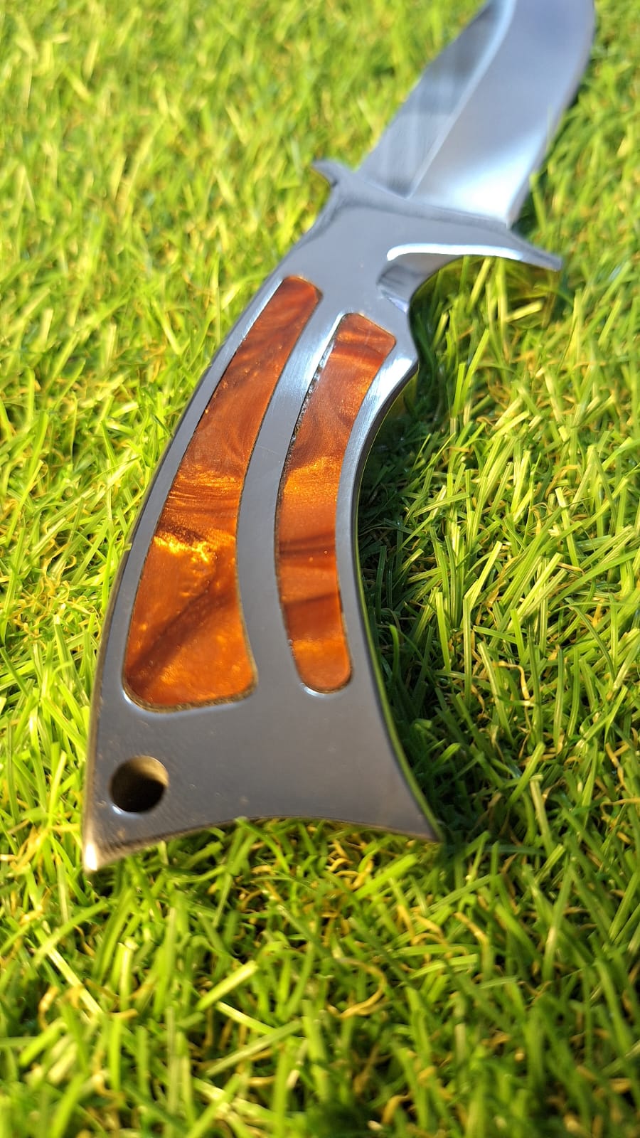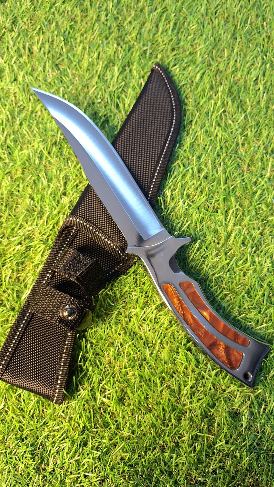 Faca lamina em inox 420ccGuarda e pomo em açoCabo em aço detalhada em resinaAcompanha bainha de transporte em nylon militar