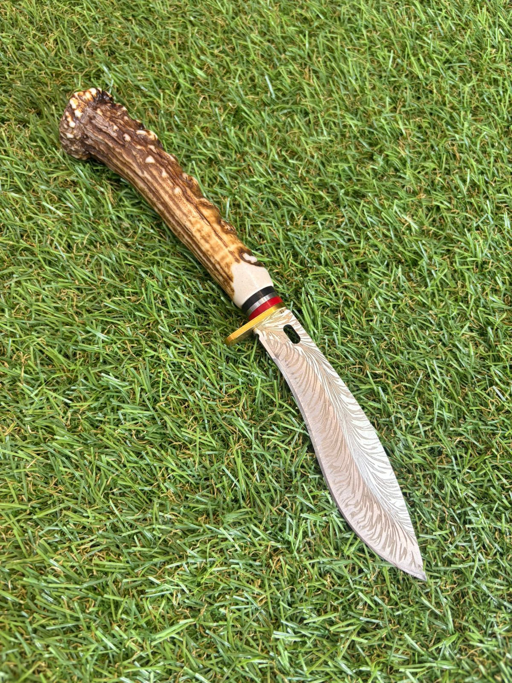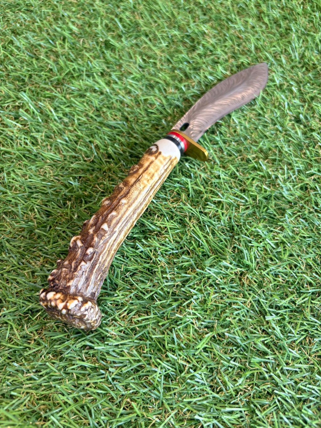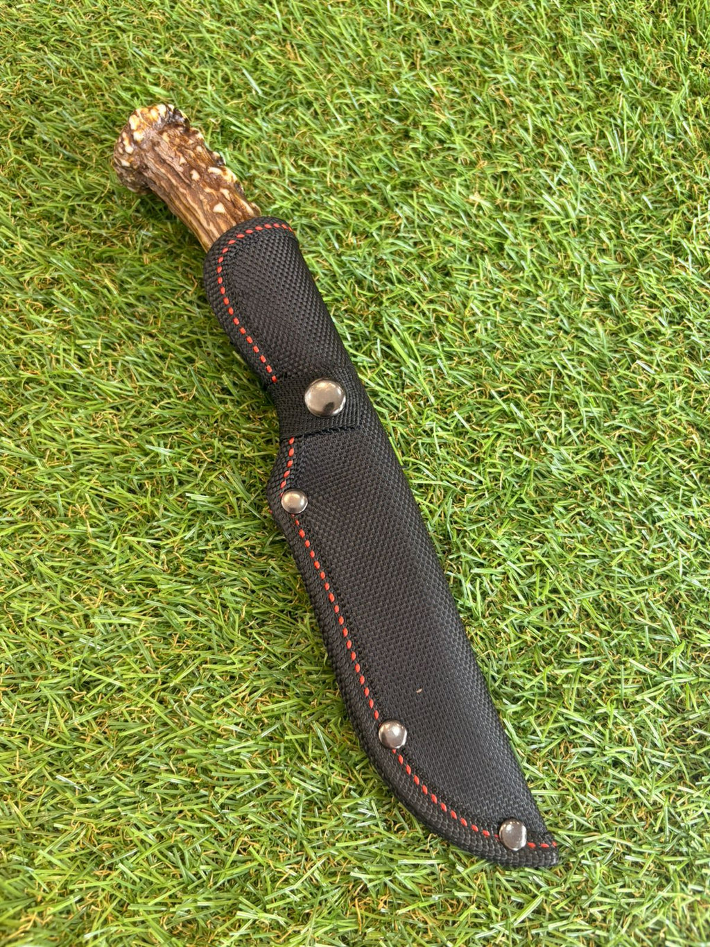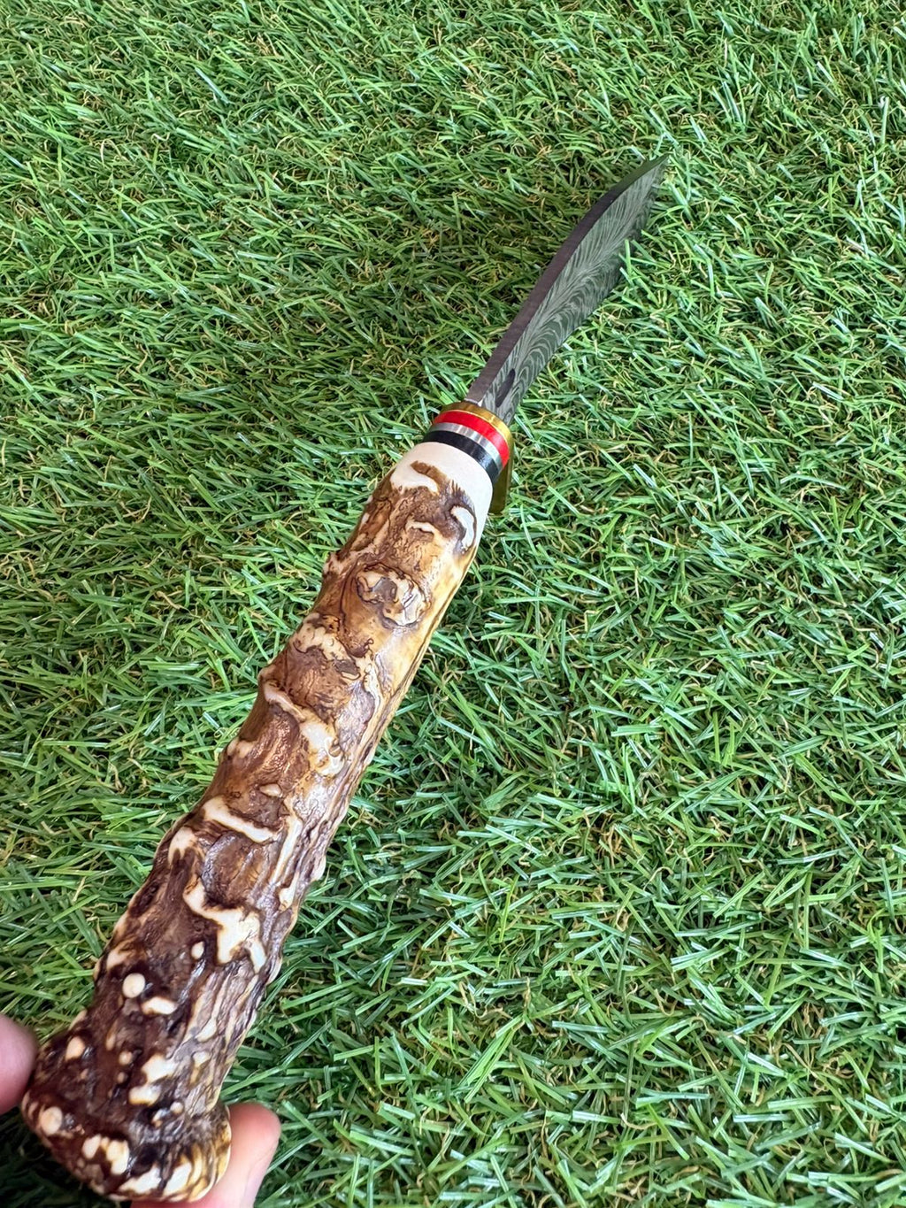 Uma peça diferenciada, com visual rústico e imponente, combinando lâmina com padrão estilo aço damasco e cabo em chifre de cervo sintético. Ideal para quem busca exclusividade e presença no uso ou na coleção.