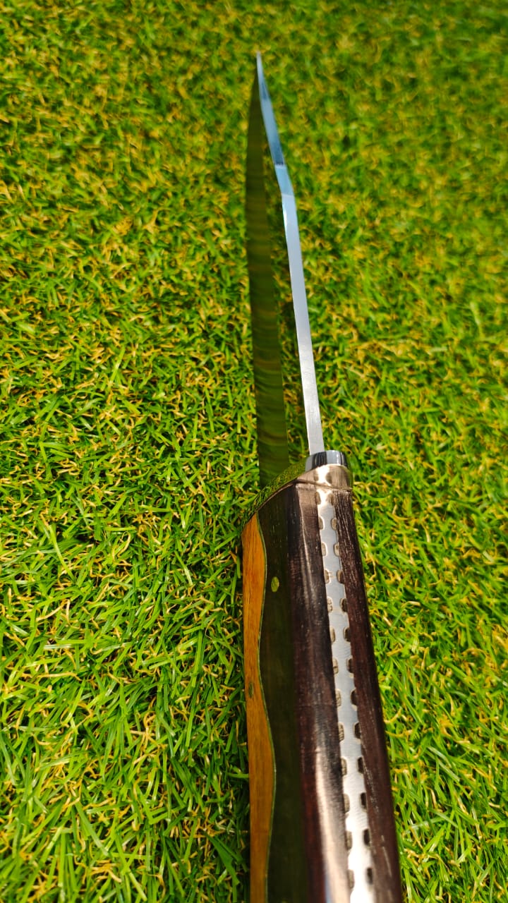 Lâmina aço inox 420Cabo em madeira mistaGuarda metálicaPossui passa fiel Acompanha bainha nylon militarComprimento total: 30,5 cmComprimento da Lâmina: 18,5 cmEspessura do Dorsso: 3,5 ml