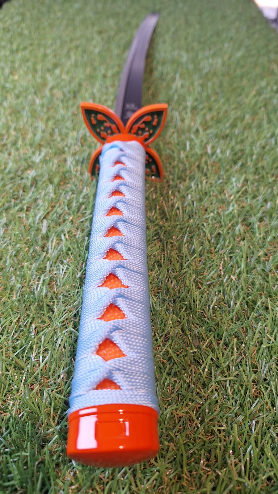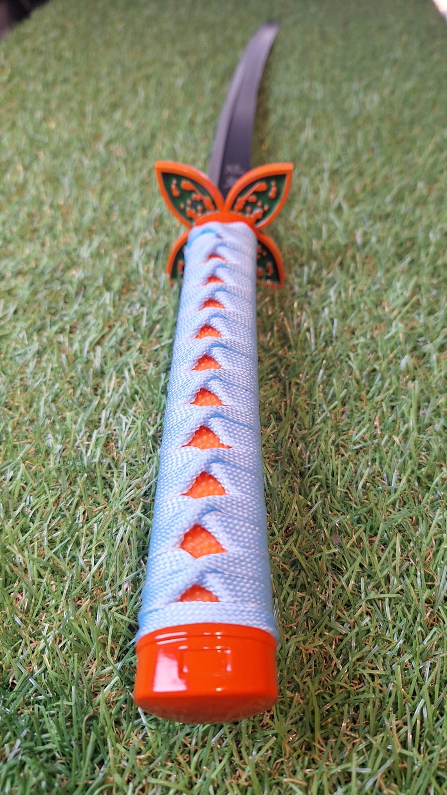 • Cabo em tecido bicolor: A empunhadura é envolta por fita azul clara com detalhes em laranja, proporcionando boa aderência e visual ousado, ideal para exposição ou uso em trajes cosplay.