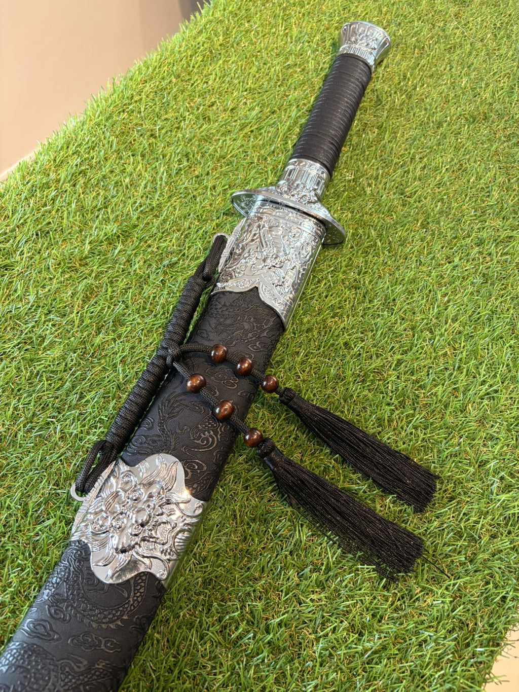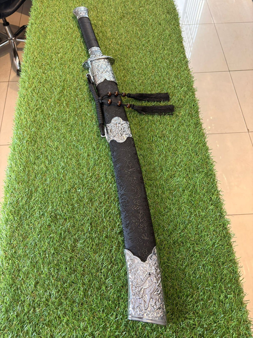 - Peça de alto nível com acabamento refinado, combinando estética clássica oriental com detalhes ricos em relevo. Ideal para colecionadores, decoração sofisticada ou premiações de destaque.Destaques do Produto• Lâmina em aço com gravações detalhadas de dragão ao longo da extensão• Guarda e ponteira com acabamento prateado em alto relevo, com temática oriental• Cabo com empunhadura revestida, oferecendo firmeza e visual elegante• Bainha revestida em tecido preto com padrões orientais discretos• Detalhes metálicos trabalhados na bainha, reforçando o aspecto premium• Acompanha cordão decorativo com pingentes e estojo com interior em cetimConstrução e Acabamento• Estrutura sólida, bem alinhada e com excelente encaixe• Acabamento metálico polido de alto padrão• Peça com forte presença visual e riqueza de detalhesDiferencialVisual mais sofisticado e clássico, com predominância de tons escuros e prata, ideal para quem busca uma peça elegante e imponente ao mesmo tempo.Comprimento total: 82,5cmLâmina: 57,5cmEspessura: 5mm