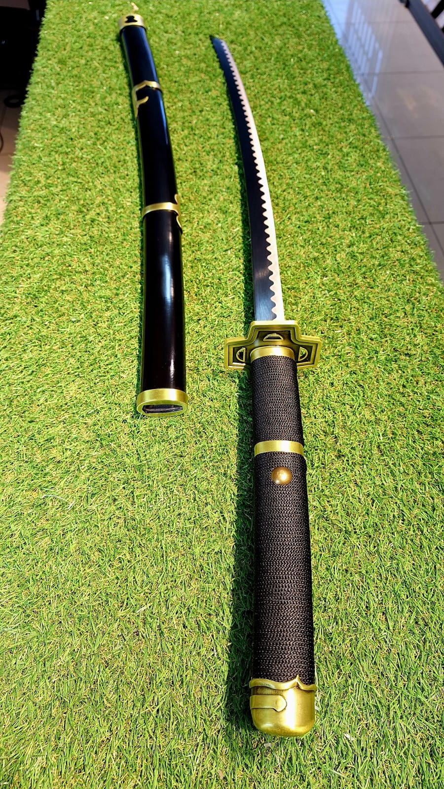 Inspirada na renomada katana Yubashiri, empunhada por Roronoa Zoro na famosa série One Piece, esta réplica apresenta acabamento de alta qualidade, ideal para colecionadores e entusiastas de cultura pop. A peça possui lâmina confeccionada em aço carbono, bainha em madeira laqueada em preto brilhante com detalhes metálicos refinados, fielmente reproduzindo o visual do anime.
