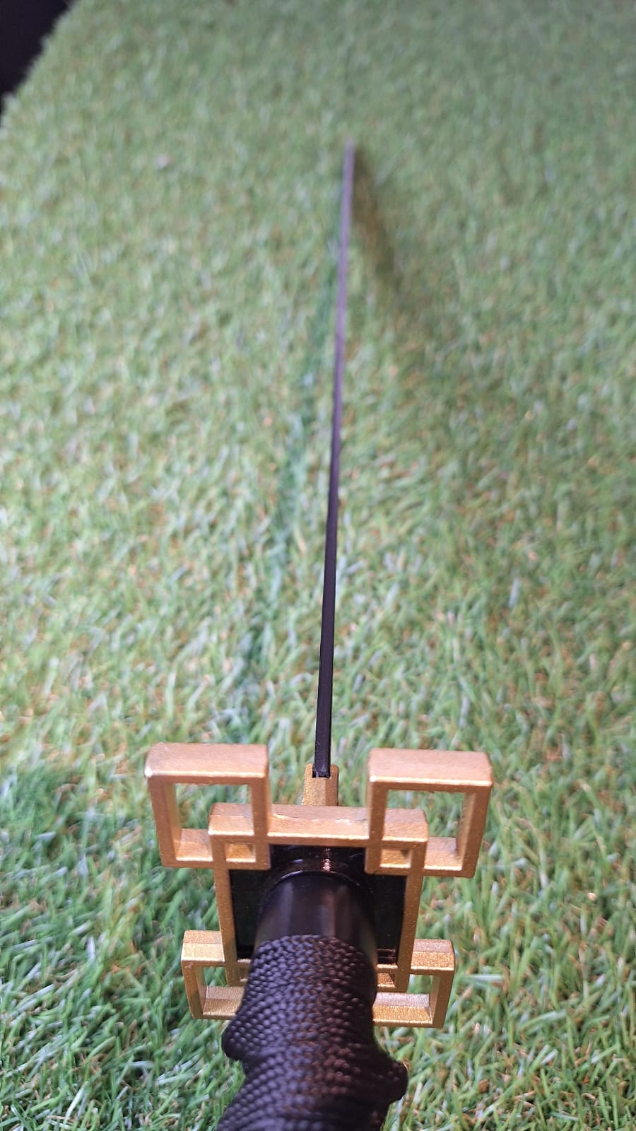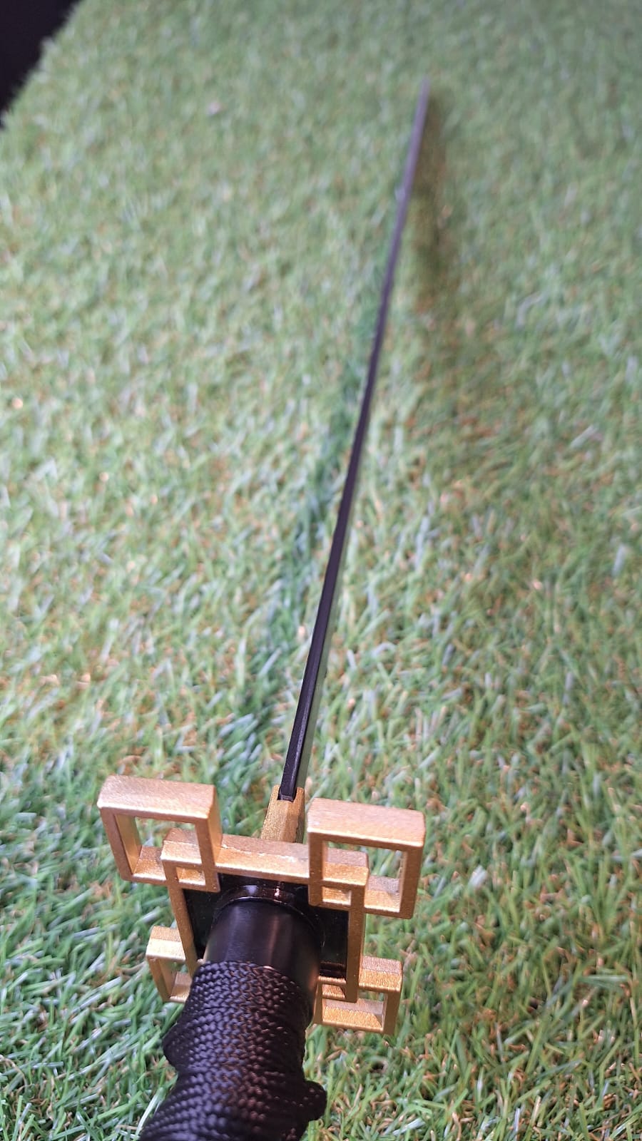 Tsuba geométrica dourada: A guarda da katana é um diferencial estético e simbólico. Com design quadrado estilizado e acabamento dourado, adiciona imponência e estilo único à espada.
